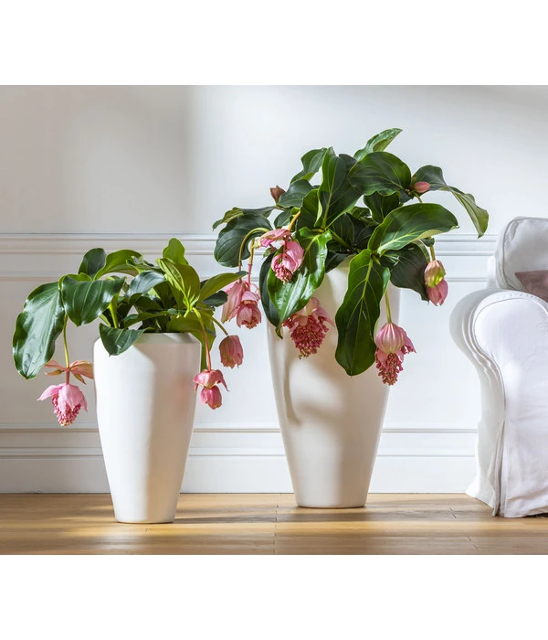 Die Medinille zählt zu den Schwarzmundgewächsen und ist ursprünglich auf den Philippinischen Inseln beheimatet. Ihr botanischer Name ehrt sie, denn ‚magnifica‘ bedeutet übersetzt ‚prächtig‘ oder ‚majestätisch‘ und weißt somit auf die opulenten rosaroten Blütenständen hin, die bei ausgewachsenen Pflanzen bis zu 30 cm lang werden können. Doch nicht nur das macht die Pflanze so beliebt: An einer Rispe sitzen bis zu 100 Einzelblüten dicht an dicht, die sich über 10 Wochen an der Pflanze halten. Ihrem exklusiven Ruf wird die Medinilla auch bezüglich der Pflege gerecht, doch bei einem solchen pompösen Auftritt, den diese Zimmerpflanze hinlegt, lohnt sich der Aufwand allemal.