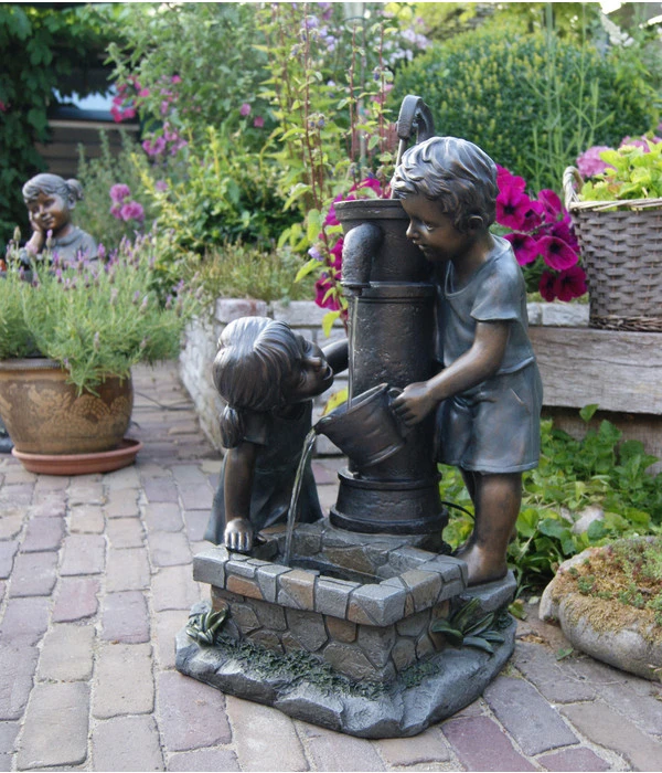 Wasser ist eines der schönsten Spielzeuge für Kinder, mit dem sie sich stundenlang beschäftigen und dabei die Umwelt völlig vergessen können. Zwei ins Spiel mit Wasser vertiefte Kinder hat der Künstler zum Vorbild genommen, als er den Ubbink Polyresin-Gartenbrunnen Atlanta schuf. Eine bezaubernde Szenerie, die sich vor 100 Jahren irgendwo auf dem Land ereignet haben könnte: in einem blühenden Bauerngarten oder auf dem Dorfplatz, wohin die Mutter die Zwei vielleicht zum Wasserholen geschickt hatte. Und nicht nur die beiden Kinder sind im nostalgischen Stil gestaltet, auch der Schwengelbrunnen sieht den historischen Vorbildern zum Verwechseln ähnlich. Holen Sie sich mit dem Ubbink Polyresin-Gartenbrunnen Atlanta ein Stückchen gute, alte Zeit in Ihren Outdoor-Bereich, Sie werden immer wieder gerne Ihre Blicke darauf richten und sich an der reizvollen Szenerie erfreuen.