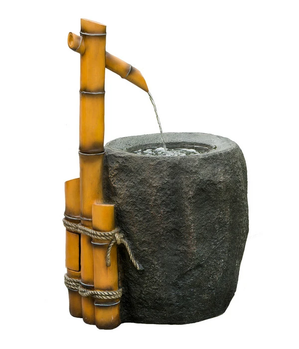 Die Bambusrohre sind natürlich keine Bambusrohre und der Wassertrog besteht nicht aus echtem Naturstein, denn echter Bambus würde im Laufe der Jahre altern und brüchig werden und der Wassertrog wäre kaum ohne Maschine zu bewegen. In Wirklichkeit besteht der Ubbink Polyresin-Gartenbrunnen Pigadia aus dem modernen Kunststein Polyresin, der leicht im Handling ist, aber schwer was aushält. Denn der Kunststein ist absolut witterungsbeständig und hält auch starker UV-Strahlung locker Stand.